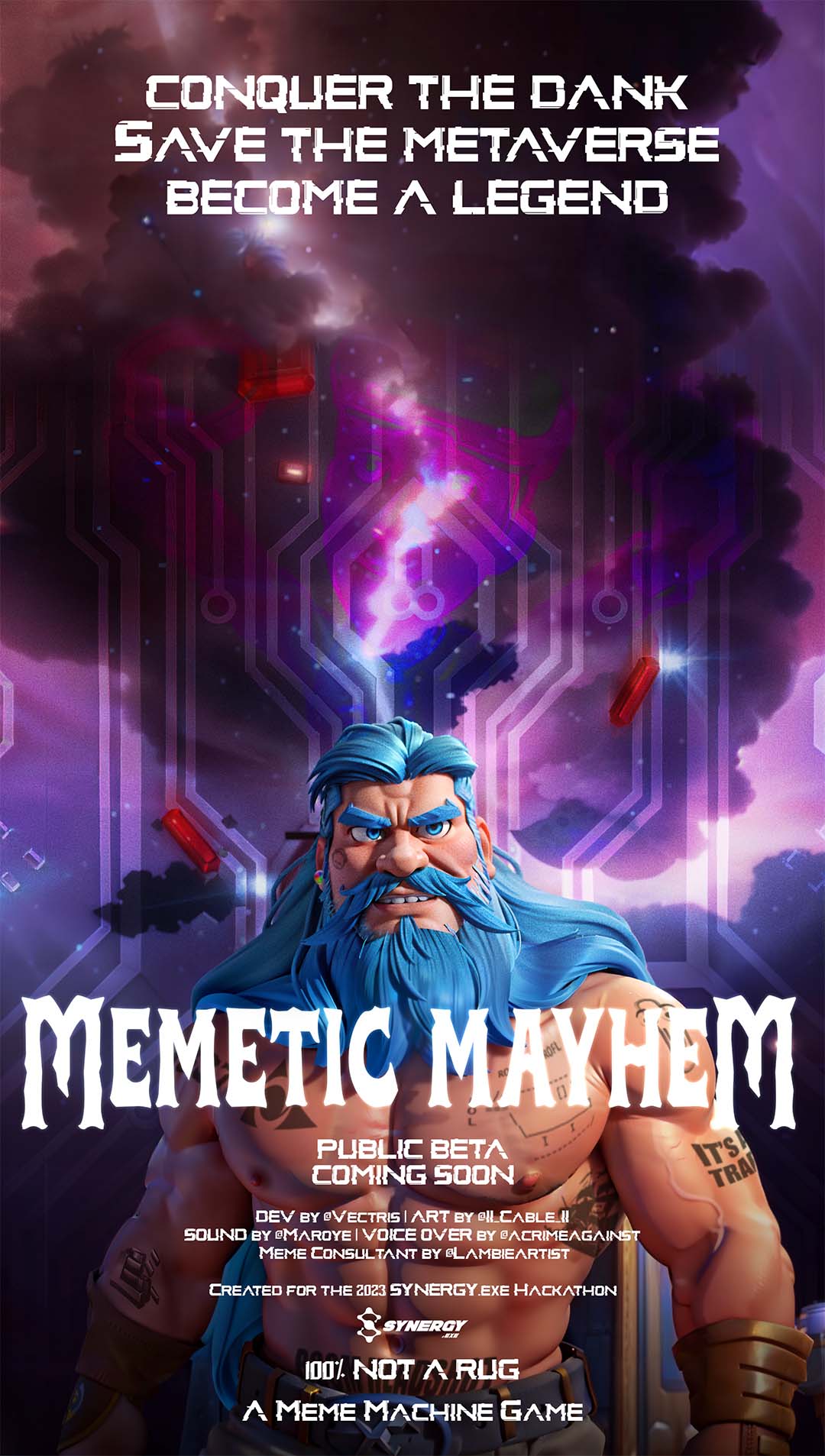 Memetic Mayhem is a first person shooter created as part of the 2023 Synergy hackathon at Oshi Gallery. You play as Memius, god of the memes battling to defeat Zuck who has enslaved the greatest memes and is on a path to destroy the Metaverse.